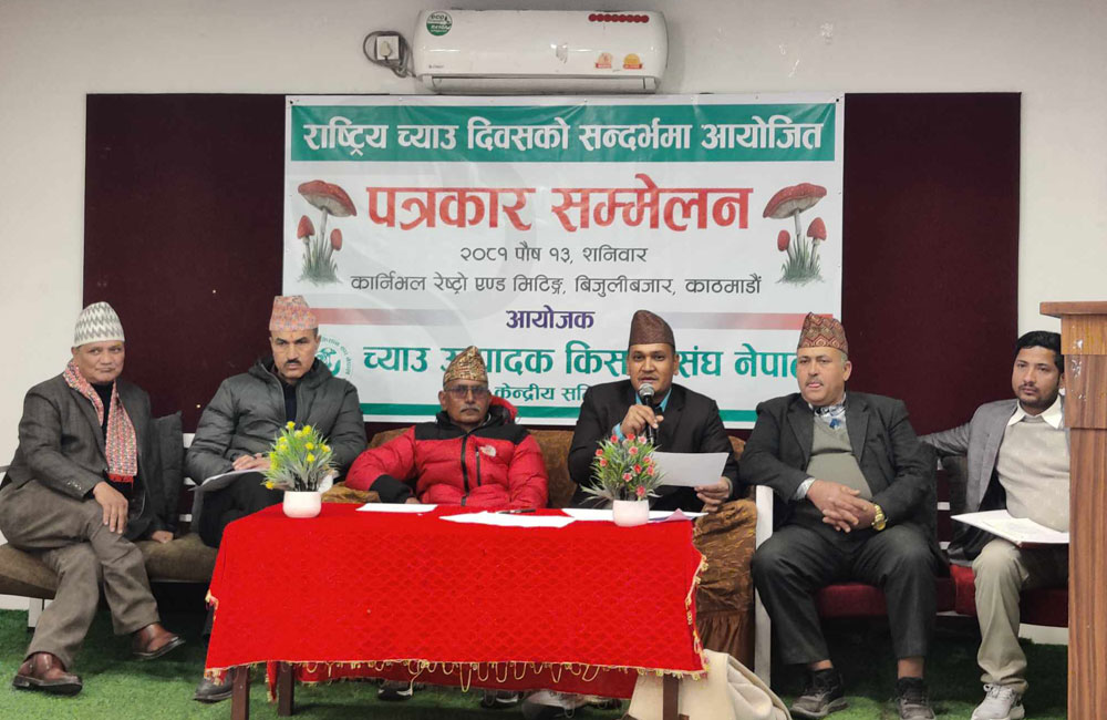 काठमाडौं, १३ पुस : राष्ट्रिय च्याउ दिवस आगामी पुस १५ गते आयोजना हुने भएको छ । आज यहाँ आयोजित पत्रकार