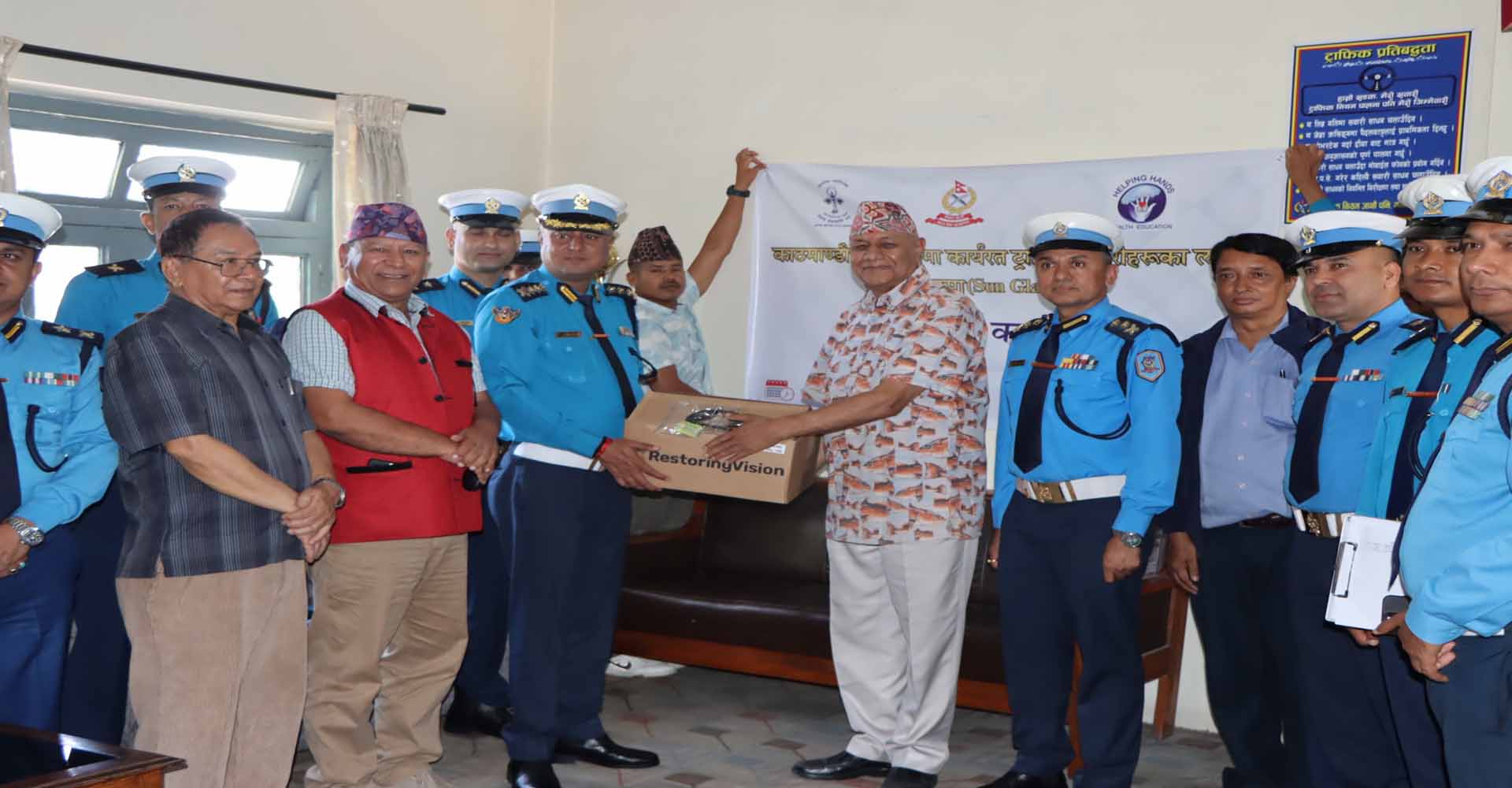 काठमाडौँ, २४ असारः काठमाडौँ उपत्यकामा कार्यरत ट्राफिक प्रहरीहरूको आँखा धुवाँधुलो तथा घामबाट जोगाउन नेपाल नेत्रज्योति सङ्घले चश्मा (सनग्लास) प्रदान गरेको