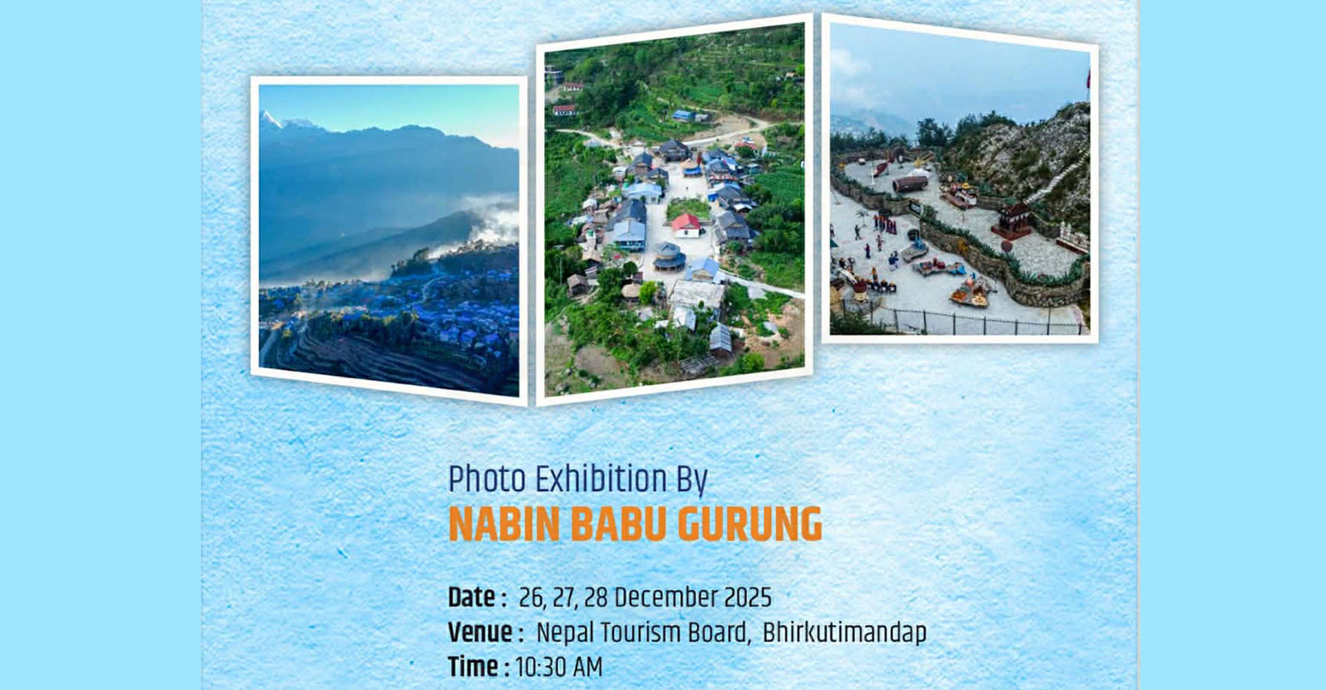 थप पढ्नुहोस्काठमाडौँ, पुस १० गते। नेपाल पर्यटन बोर्डमा शुक्रबारदेखि ड्रोनबाट खिचिएका तस्बिरको विशेष फोटो प्रदर्शनी हुँदैछ। फोटो पत्रकार नवीनबाबु गुरुङको एकल