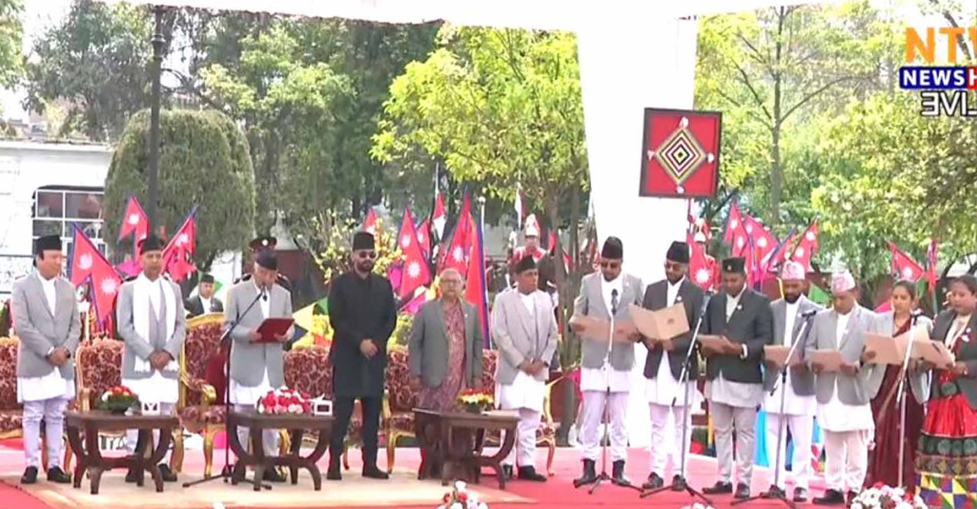 काठमाडौँ, चैत १३ गते । राष्ट्रपति कार्यालय, शीतल निवासमा आयोजित औपचारिक समारोहमा नवनियुक्त मन्त्रिपरिषद् सदस्यहरूले पद तथा गोपनीयताको शपथ ग्रहण