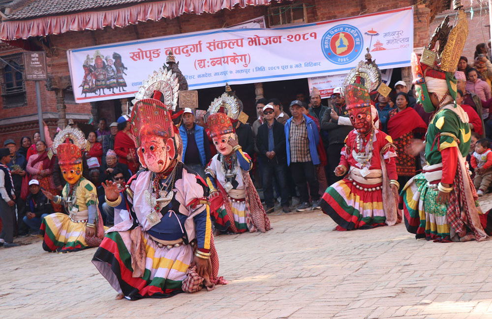 थप पढ्नुहोस्भक्तपुर, ४ पुसः मध्यपुरथिमि नगरपालिका–७ नगदेशस्थित गणेश मन्दिर प्राङ्गणमा विभिन्न नवदुर्गा नाचिरहेका छन् । सयौँको सङ्ख्यामा महिलाहरु हातमा पूजाको थाली