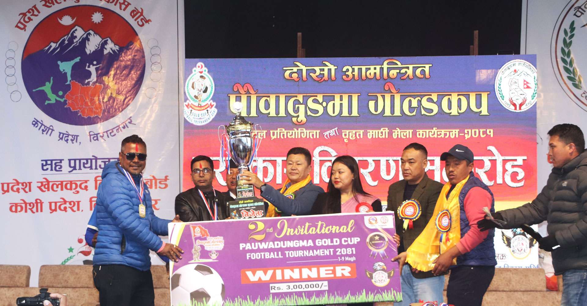 थप पढ्नुहोस्भोजपुर, ९ माघः पौवादुङमा गोल्ड कप दोस्रो संस्करणको उपाधि राजगढ फुटबल क्लब झापाले जितेको छ । आज भएको फाइनल खेलमा
