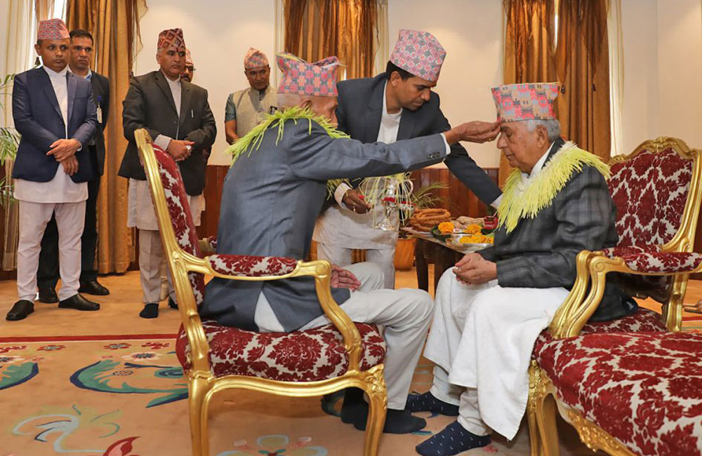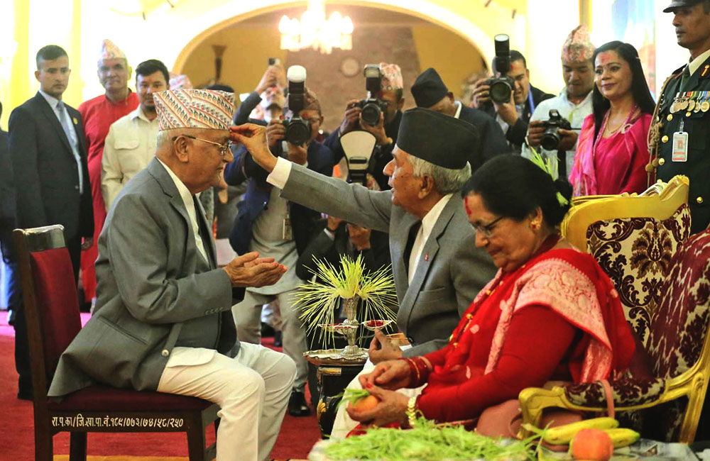 थप पढ्नुहोस्२६असोज, काठमाडौं । राष्ट्रपति भवन शीतल निवासमा टीका अति-विशिष्ट र विशिष्ट व्यक्तित्वलाई टीका लगाइदिने कार्यक्रम सुरू भएको छ । राष्ट्रपति