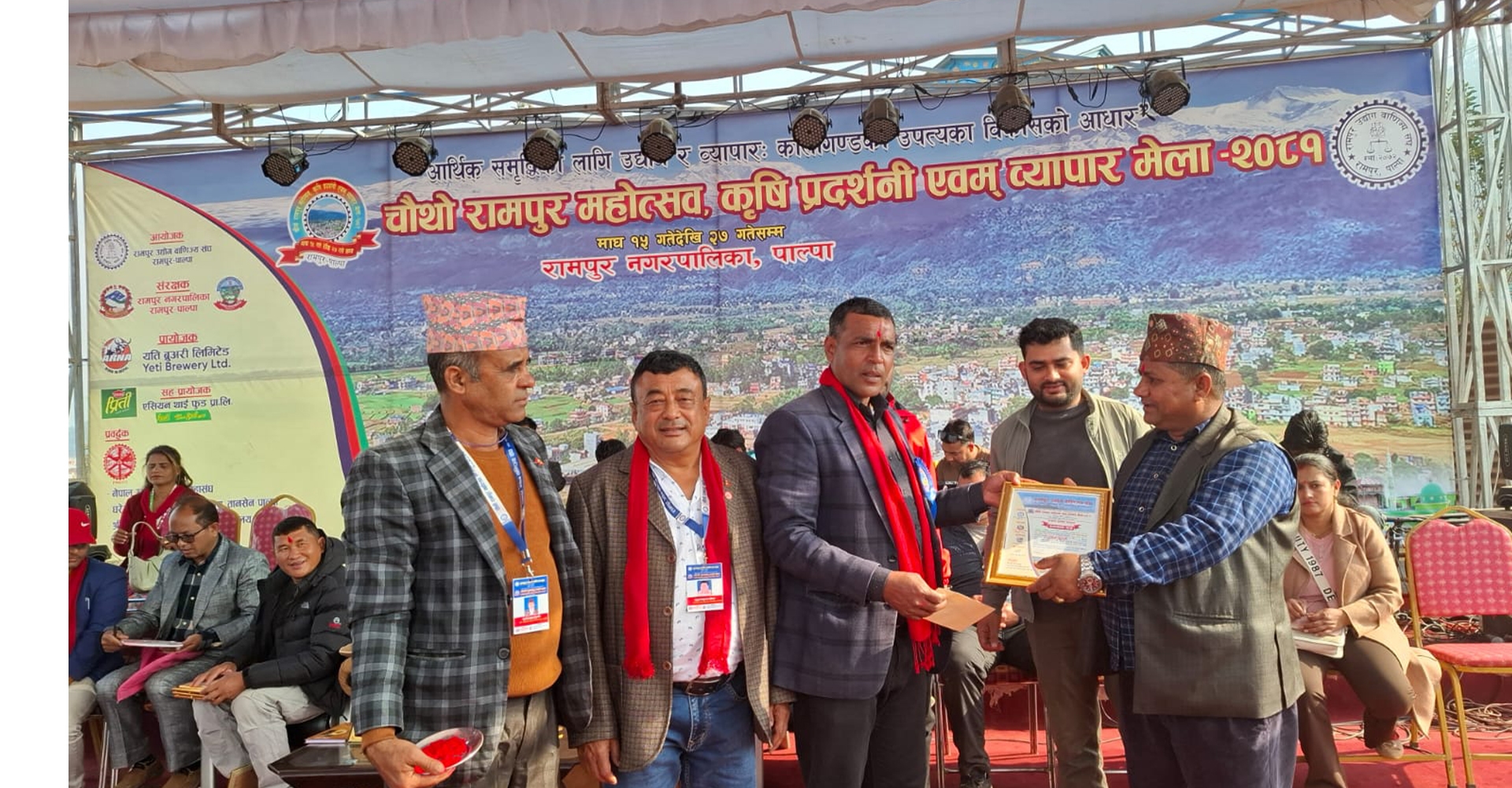 थप पढ्नुहोस्रामपुर (पाल्पा), २७ माघः रामपुर नगरपालिका भित्र कृषि तथा पशुपालनमार्फत सफलतापूर्णक व्यवसाय गर्ने किसानलाई प्रोत्साहन गर्दै पुरस्कृत गरिएको छ ।