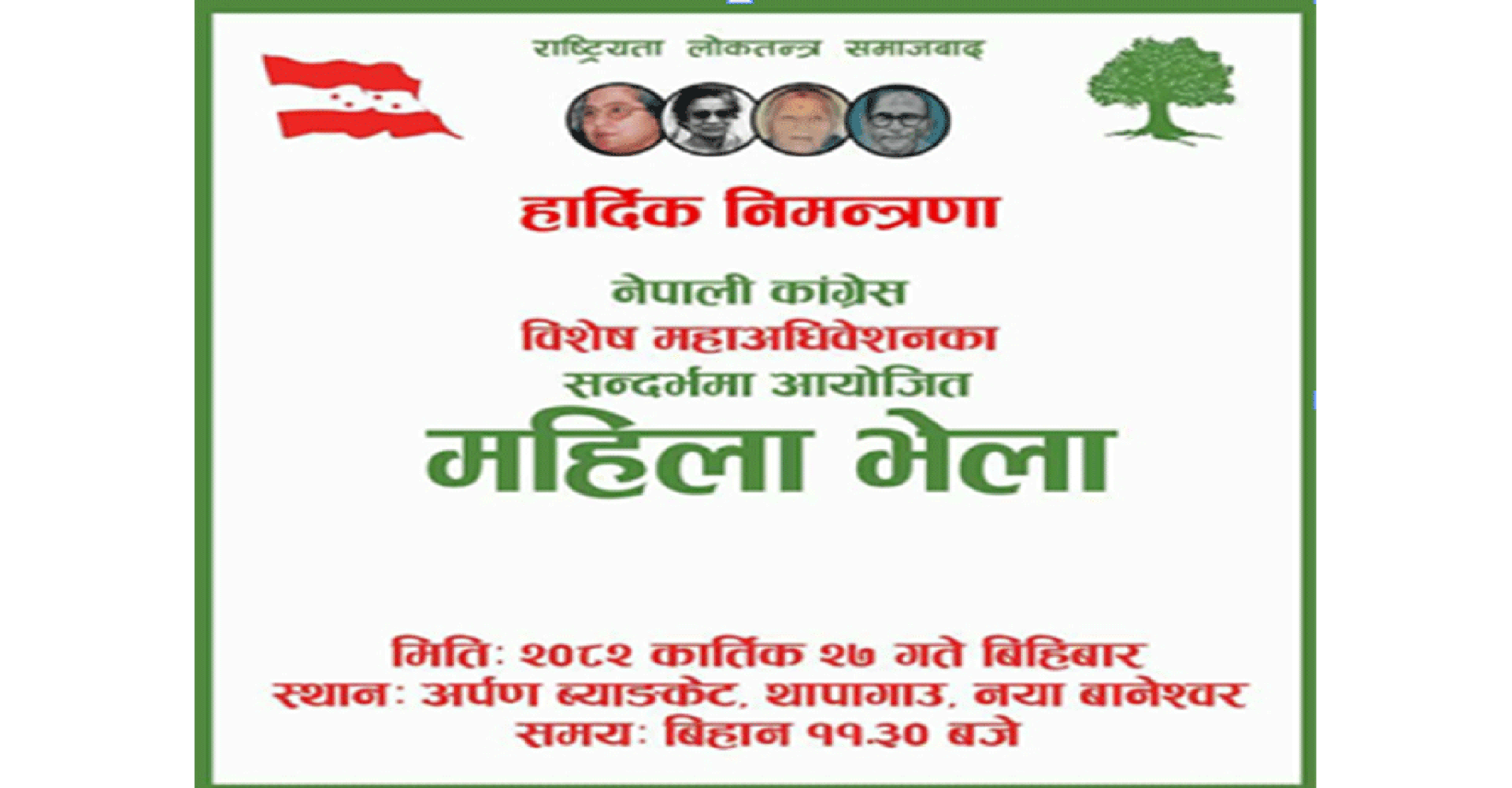 थप पढ्नुहोस्काठमाडौँ, कात्तिक २७ गते । नेपाली काँग्रेसको विशेष महाधिवेशन पक्षधरले महिला भेलाको आयोजना गरेको छ । विशेष महाधिवेशनका लागि पार्टीमा