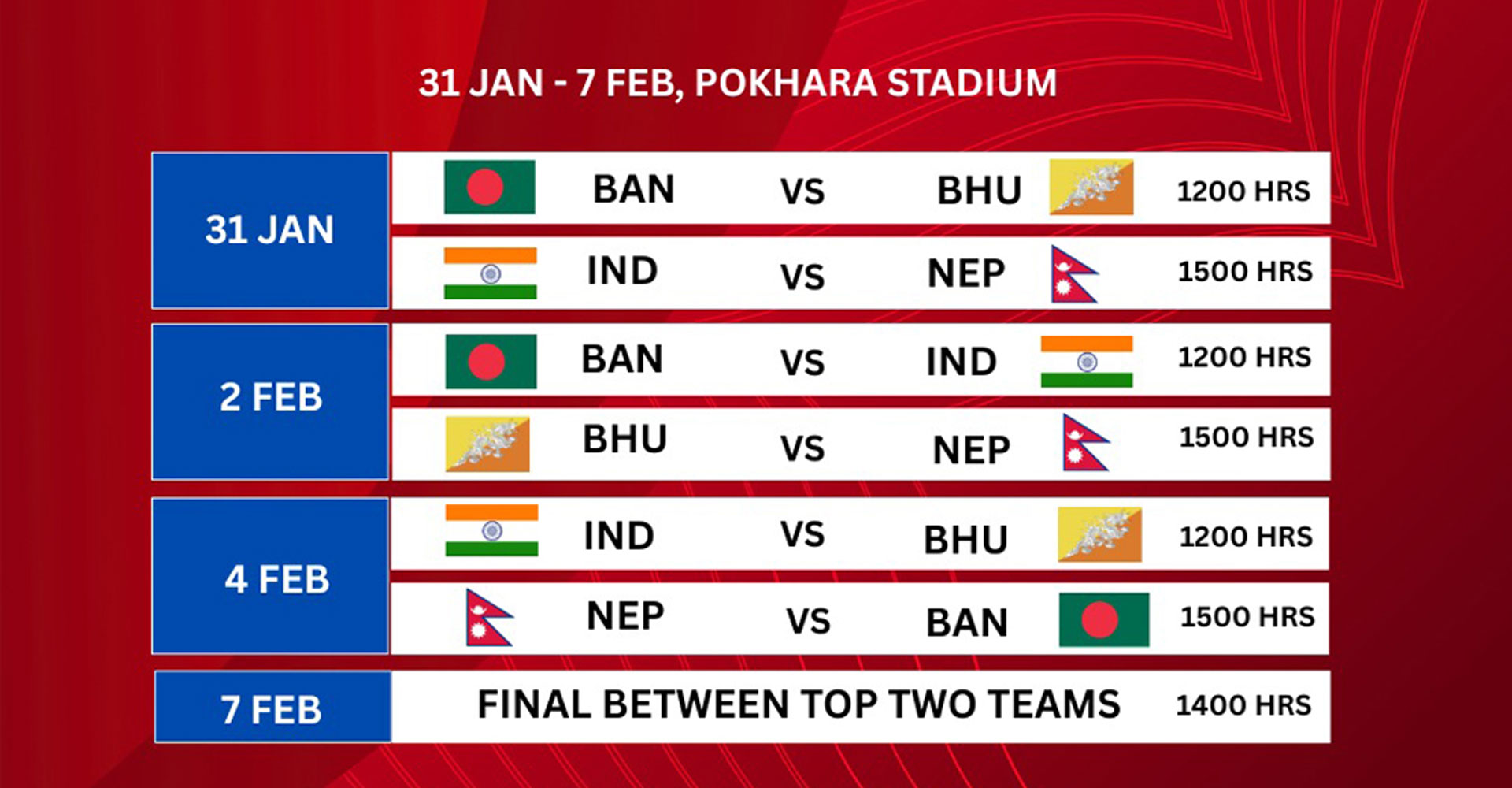 माछापुच्छ्रे (कास्की), माघ २४ गते । बङ्गालादेशसँग लिग चरणमा खेलेको हारको बदला लिँदै दक्षिण एसियाली खेलकुद महासङ्घ (साफ) यु–१९ महिला
